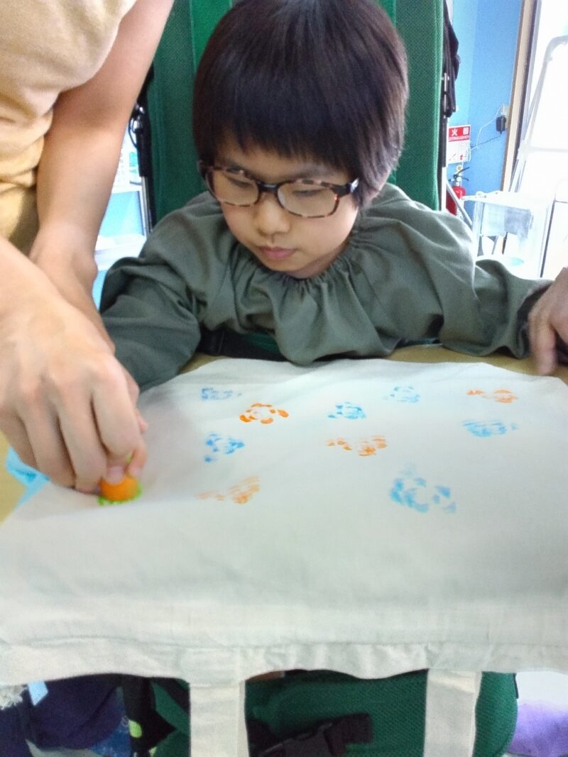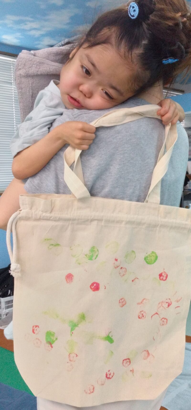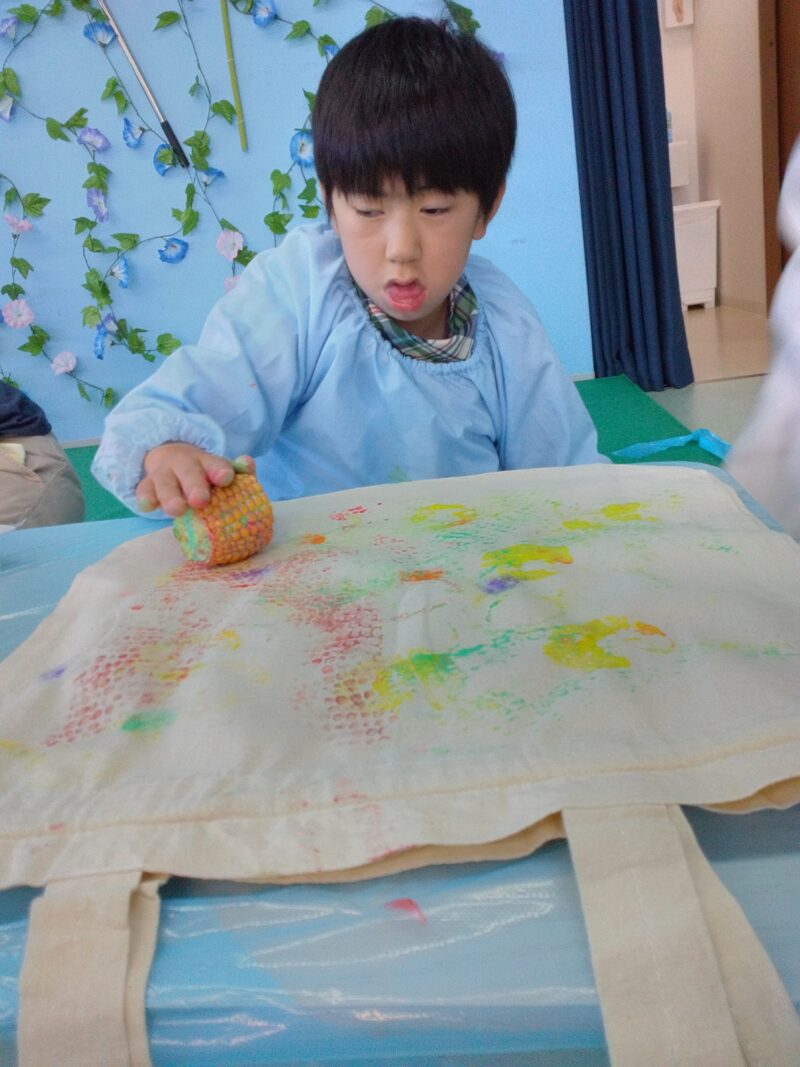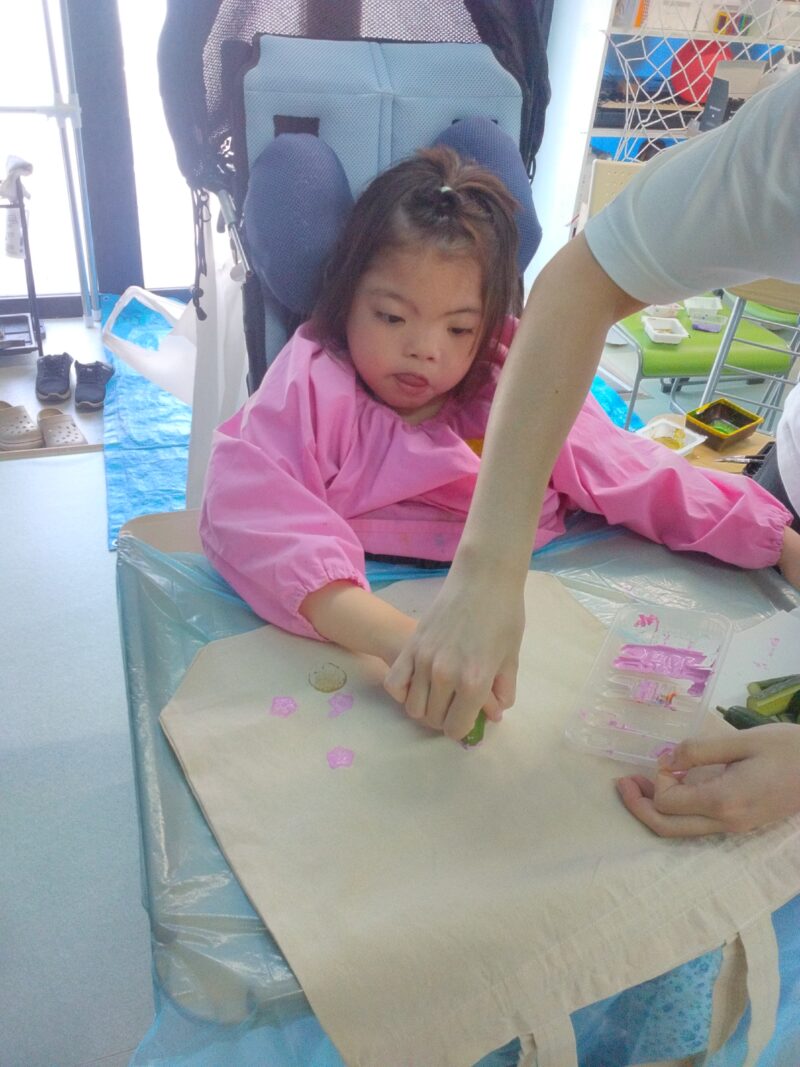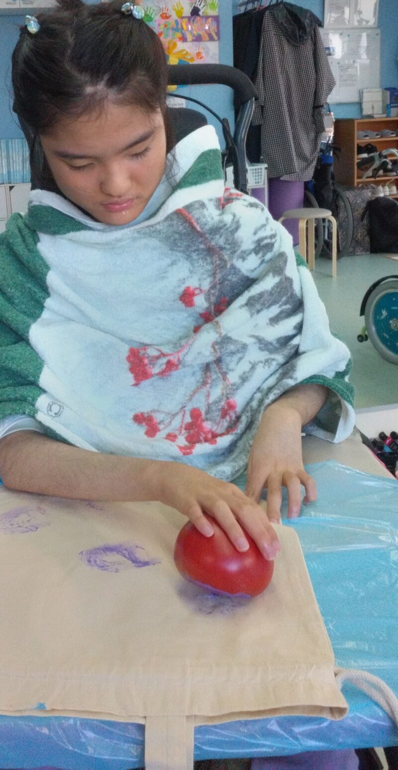 既製品の製作用無地トートバッグへ、ペタペタとスタンプしていきます。