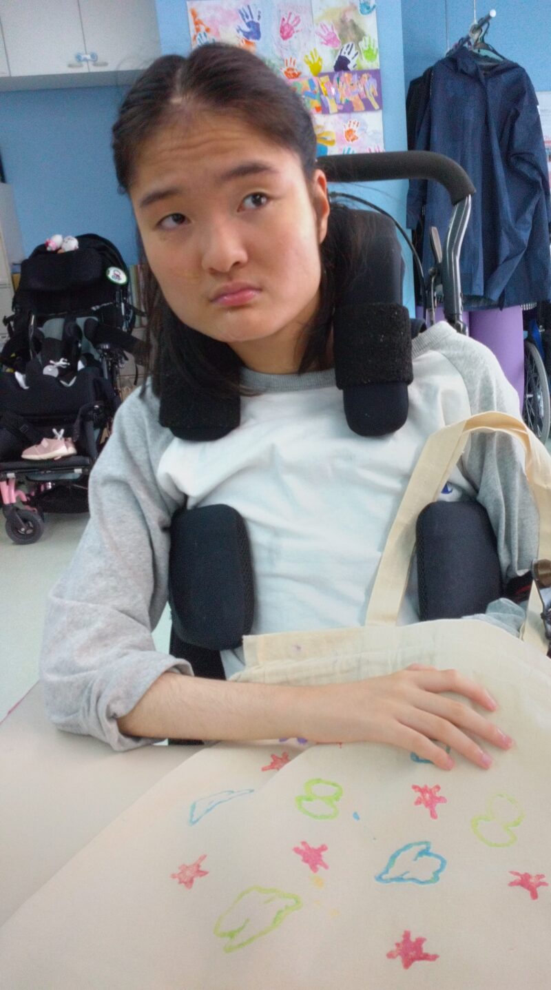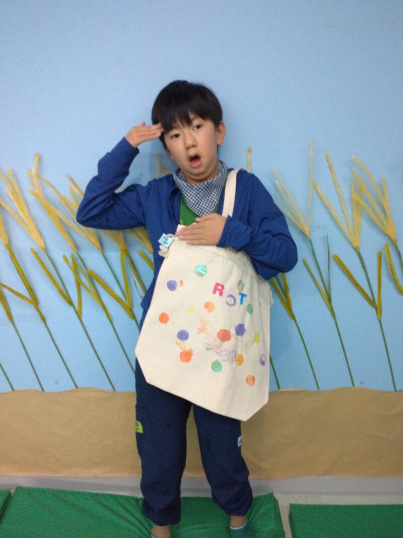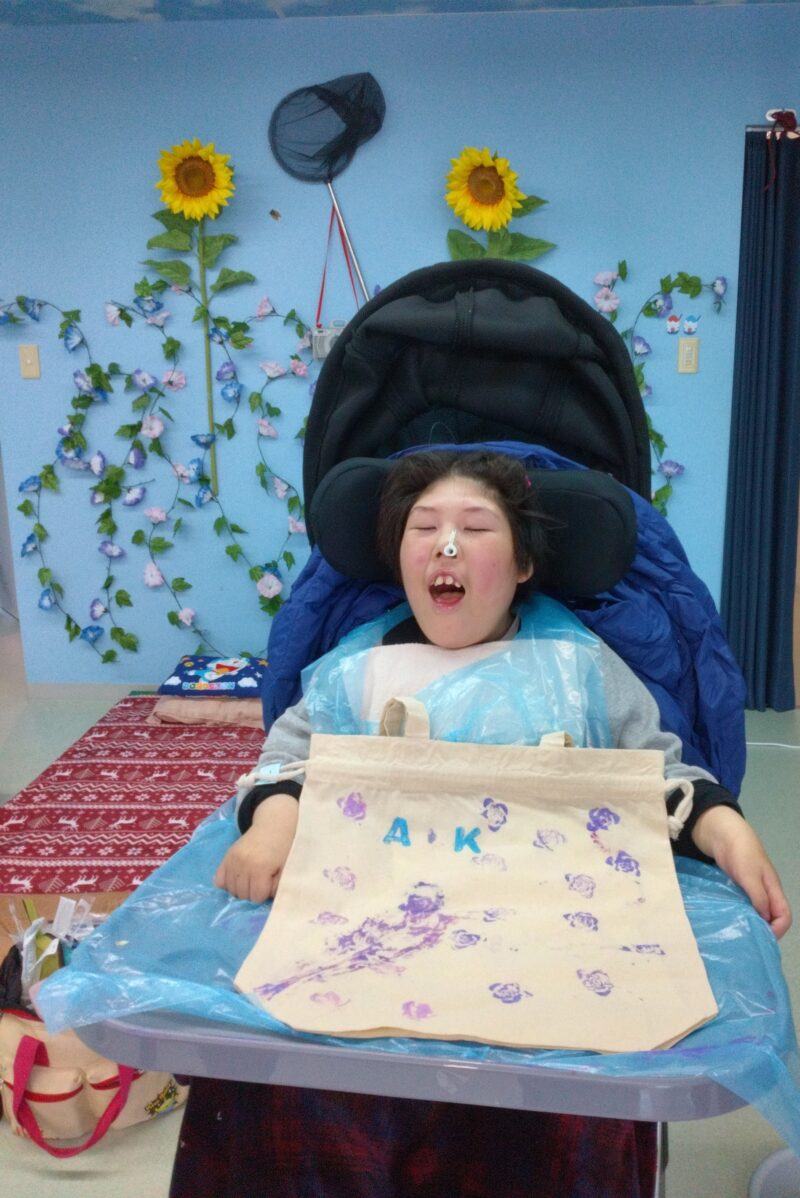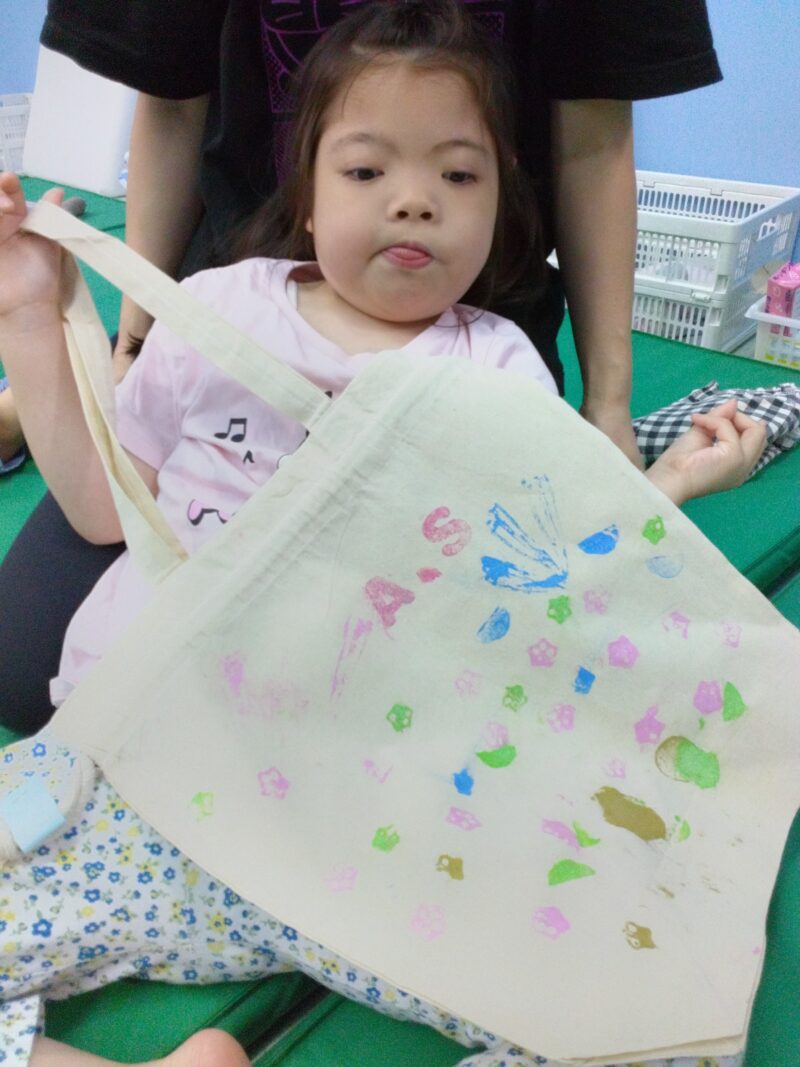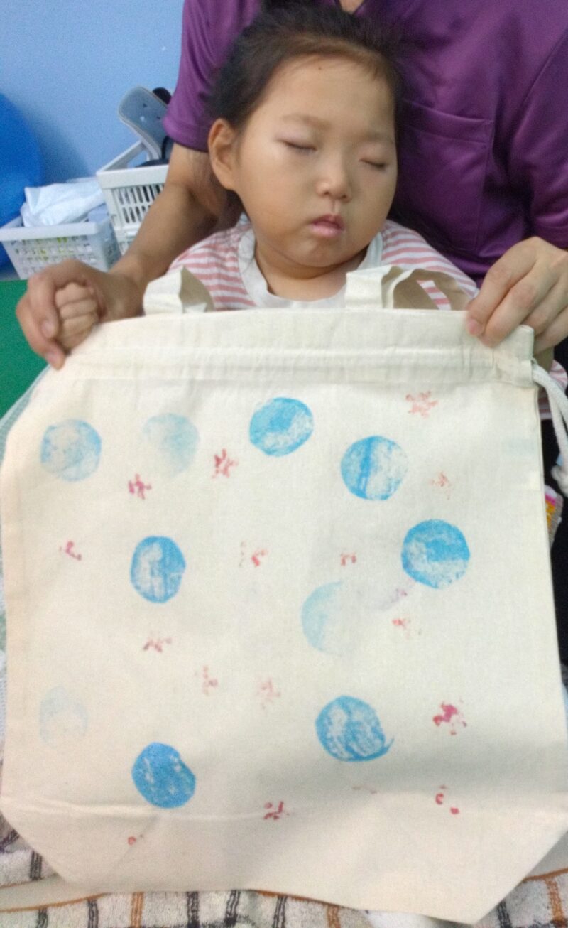 既製品の製作用無地トートバッグへ、ペタペタとスタンプしていきます。