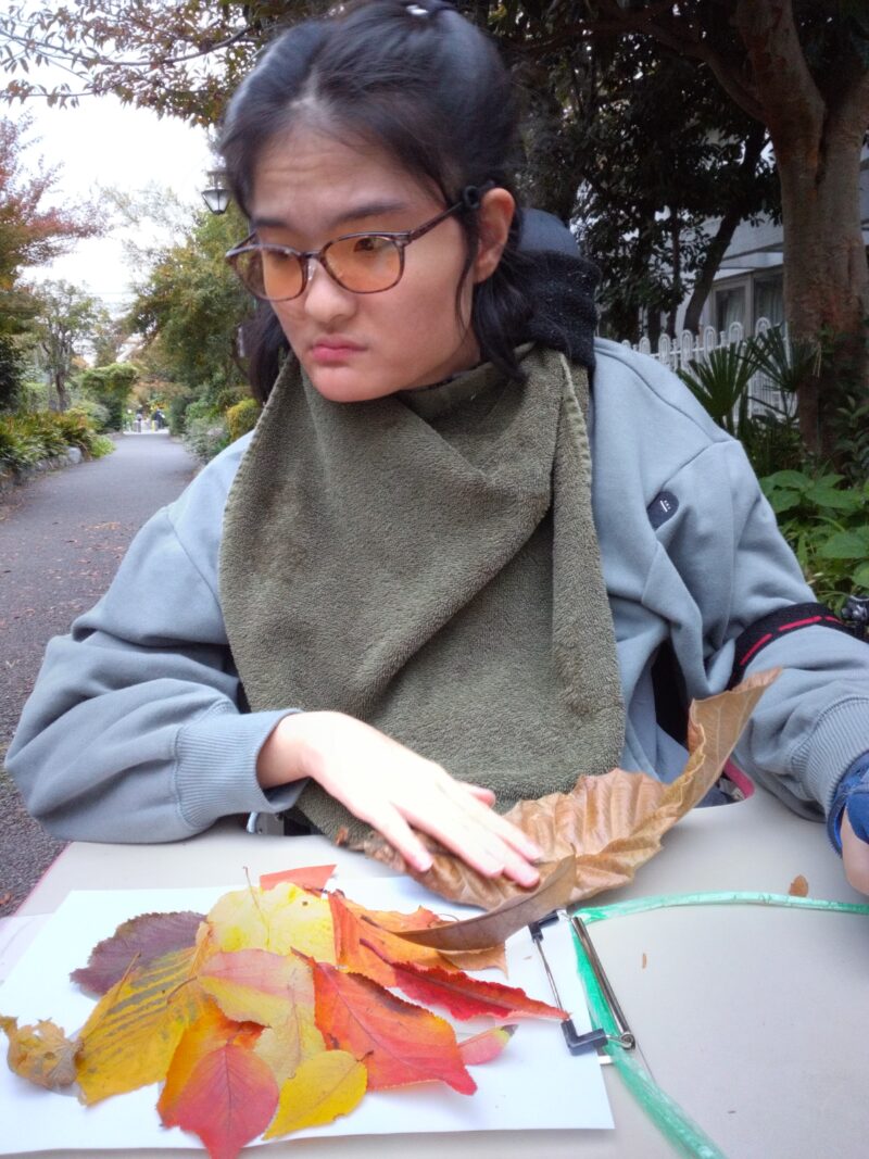 阿佐谷北児童遊園にて、拾った落ち葉でそのまま製作開始!