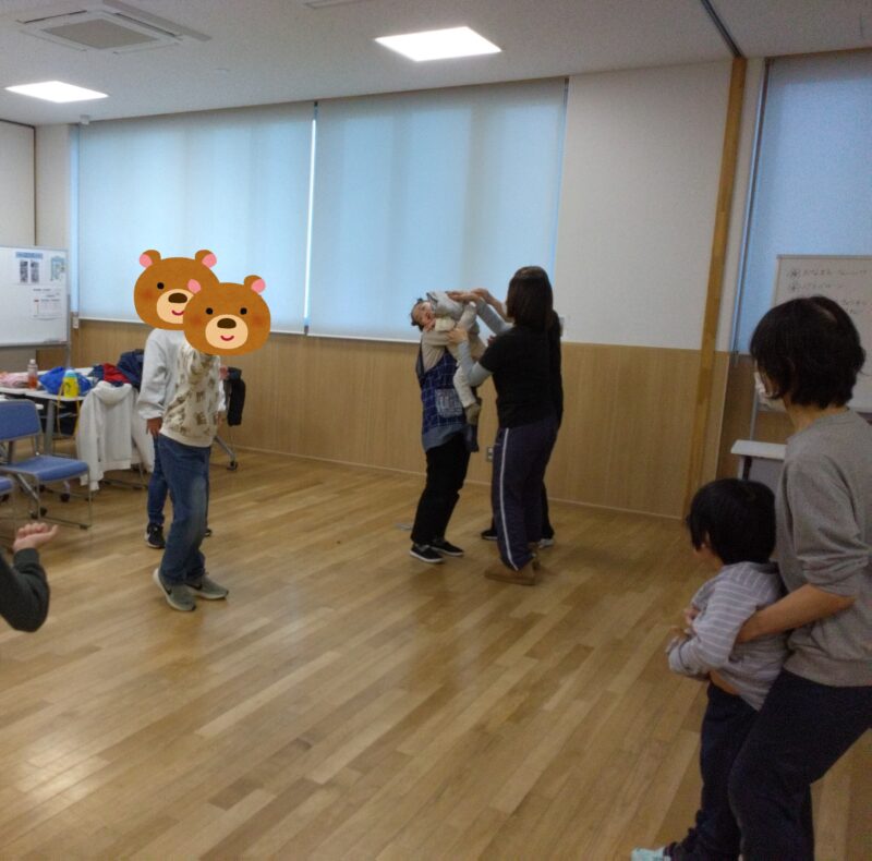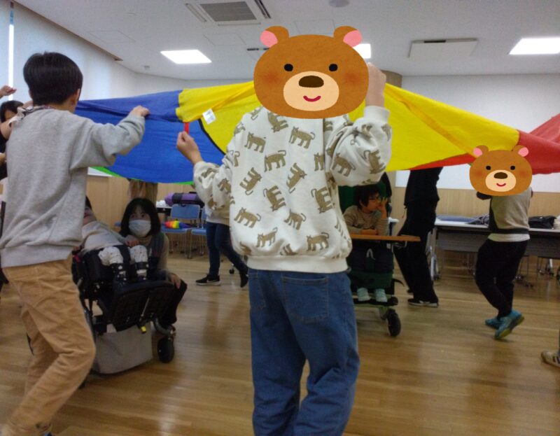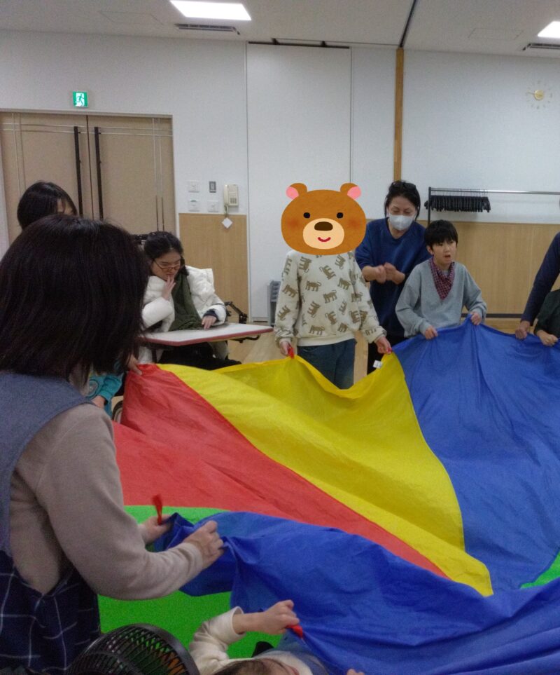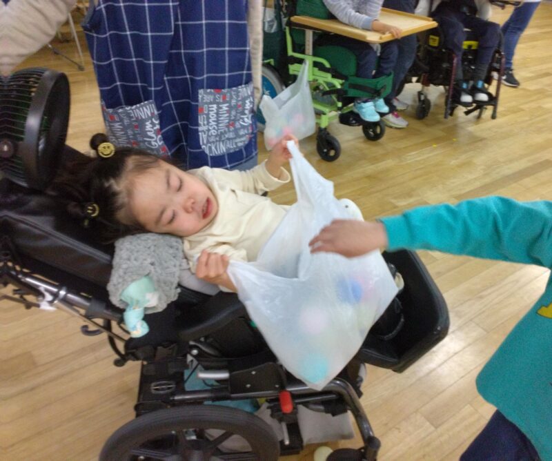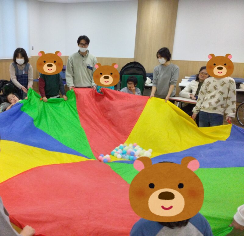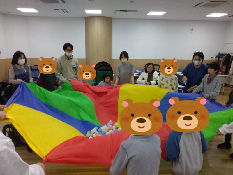 画像には納められなかったですが、パラバルーンを「せーの!」で皆で上に持ち上げた勢いで、ボールは集会室中に飛んで行きました。