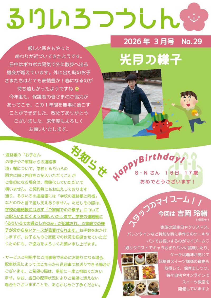 2026年3月13日 / 最終更新日時 : 2026年3月13日 3bays 未分類 るりいろつうしん るりいろつうしん3月号です。 ※写真掲載のお子さまは、ご家族から許可をいただいています。 コメントを残す コメントをキャンセルメールアドレスが公開されることはありません。 ※ が付いている欄は必須項目ですコメント ※ 名前 ※ メール ※ サイト 次回のコメントで使用するためブラウザーに自分の名前、メールアドレス、サイトを保存する。 Δ