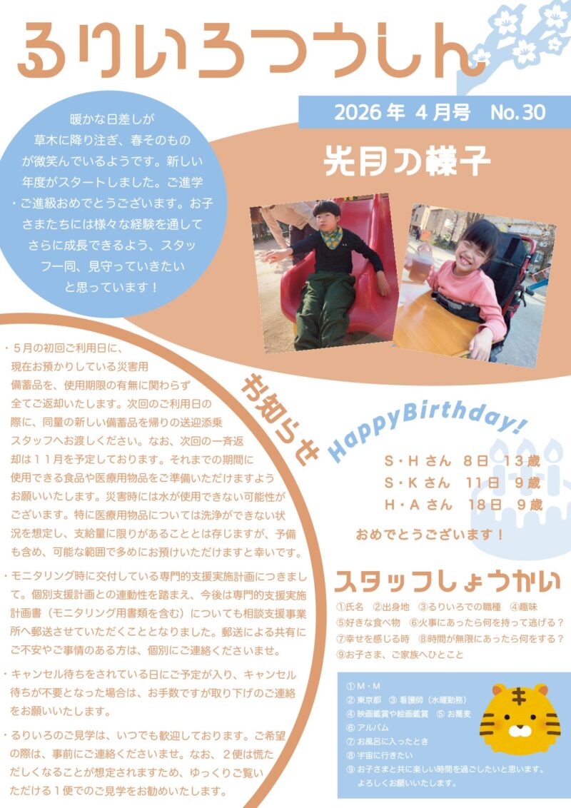 2026年4月9日 / 最終更新日時 : 2026年4月9日 3bays コラム るりいろつうしん るりいろつうしん3月号と4月号です。 ※写真掲載のお子さまは、ご家族から許可をいただいています。 コメントを残す コメントをキャンセルメールアドレスが公開されることはありません。 ※ が付いている欄は必須項目ですコメント ※ 名前 ※ メール ※ サイト 次回のコメントで使用するためブラウザーに自分の名前、メールアドレス、サイトを保存する。 Δ